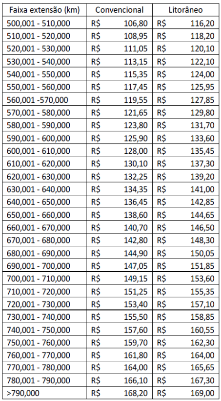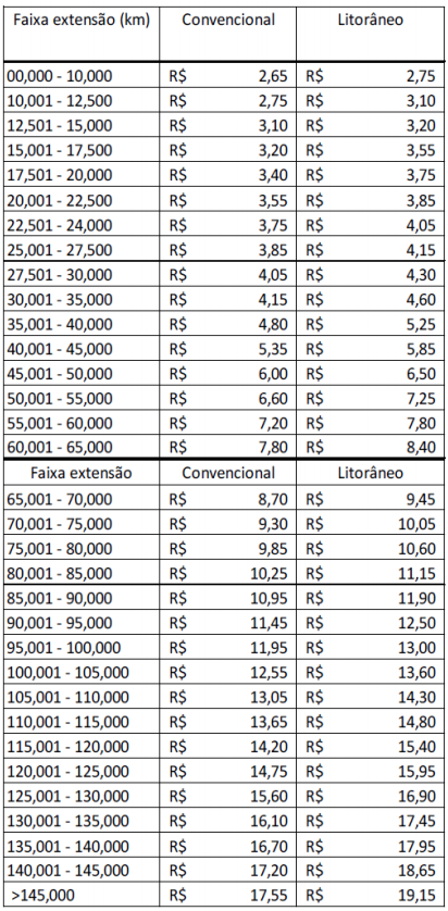 Parágrafo 2º: O enquadramento das linhas circulares, nas faixas acima estabelecidas, será feito segundo a metade da extensão da viagem completa.