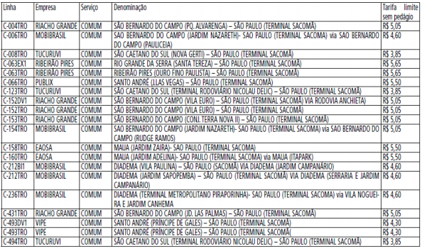 Reajuste tarifário: Integração física e tarifária envolvendo atendimentos metropolitanos do Sistema de Transporte Coletivo de Ônibus da Região Metropolitana de São Paulo, gerenciado pela Empresa Metropolitana de Transportes Urbanos de São Paulo S/A – EMTU/SP, com linhas municipais de São Paulo, gerenciadas pela São Paulo Transporte S/A – SPTrans no Terminal Sacomã