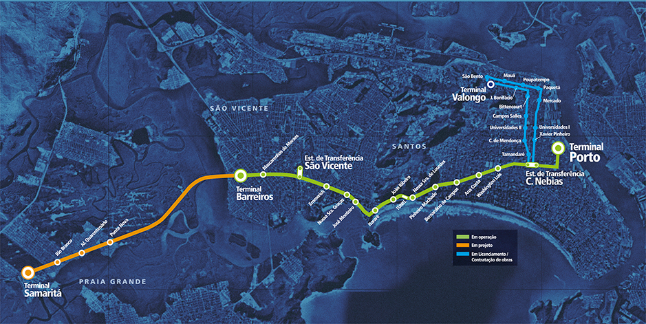 O primeiro trecho do VLT, que liga o terminal Barreiros, em São Vicente, ao Porto, em Santos, foi entregue no início de 2017. O segundo trecho teve o edital de obras aprovado pelo Governo do Estado no final de março de 2018 e ligará a estação Conselheiro Nébias ao bairro Valongo, em Santos.